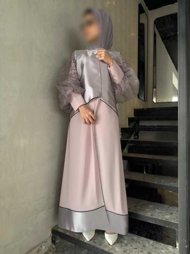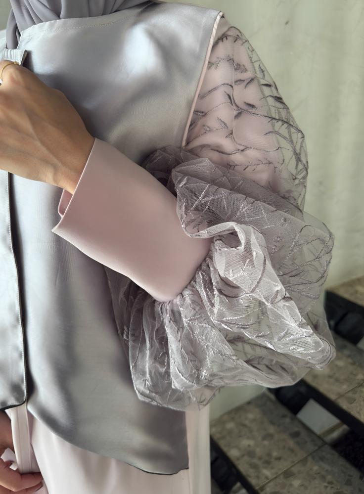 هذه العباية تتميز بتصميم فاخر وأنيق يجمع بين الخامات الراقية. تم استخدام قماش الكريب الناعم كأساس للعباية، مما يمنحها انسيابية ورقيًا. الأكمام مبطنه و مزينة بقماش التل المطرز بنقوش دقيقة ، مما يضيف لمسة من الفخامة والتفاصيل المميزة. بالإضافة إلى ذلك، تم دمج قماش التفته ليكمل المظهر العام ويعطي العباية شكلاً أنيقًا ومناسبًا للمناسبات الخاصة.